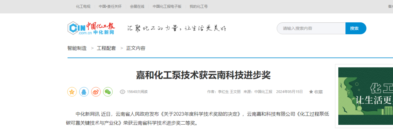 中化新网讯近日,云南省人民政府发布《关于2023年度科学技术奖励的决定》,云南嘉和科技有限公司《化工过程泵低碳可靠关键技术与产业化》荣获云南省科学技术进步奖二等...