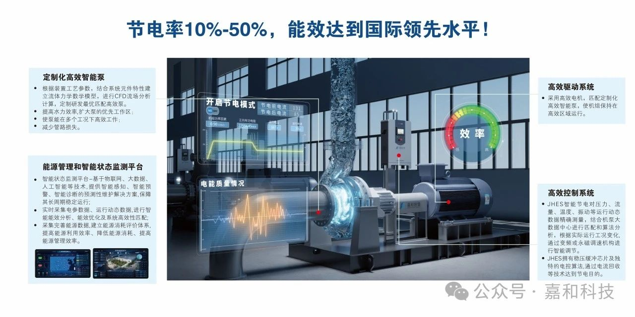 Интеллектуальная энергосберегающая система JECO включает в себя четыре аспекта: индивидуальные высокоэффективные интеллектуальные насосы, высокоэффективную систему привода, высокоэффективную систему управления, платформу интеллектуального управления энергией и интеллектуального мониторинга состояния. В сочетании с оптимизацией технологии гидравлической механики, технологией производства оборудования высокого класса и промышленной интернет-технологией, выдвинут инновационный алгоритм для быстрой оптимизации производительности насосов, в результате чего, создана интеллектуальная энергосберегающая система, объединяющая энергосбережение оборудования, оптимизацию качества потребления энергии агрегатом и управление процессом работы агрегата, цифровое управление энергией и мониторинг рабочего состояния, что позволяет осуществить высокоэффективную работу и интеллектуальное согласование технологических процессов. Она также помогает предприятиям установить возможность комплексного анализа энергопотребления, повысить эффективность управления, расширить потенциал для оптимизации энергоэффективности, снизить общий уровень выбросов углерода, чтобы обеспечить безопасность, энергосбережение, снижение выбросов углерода и сокращение расходов. По результатам оценки экспертной группы технические достижения достигли международного уровня.