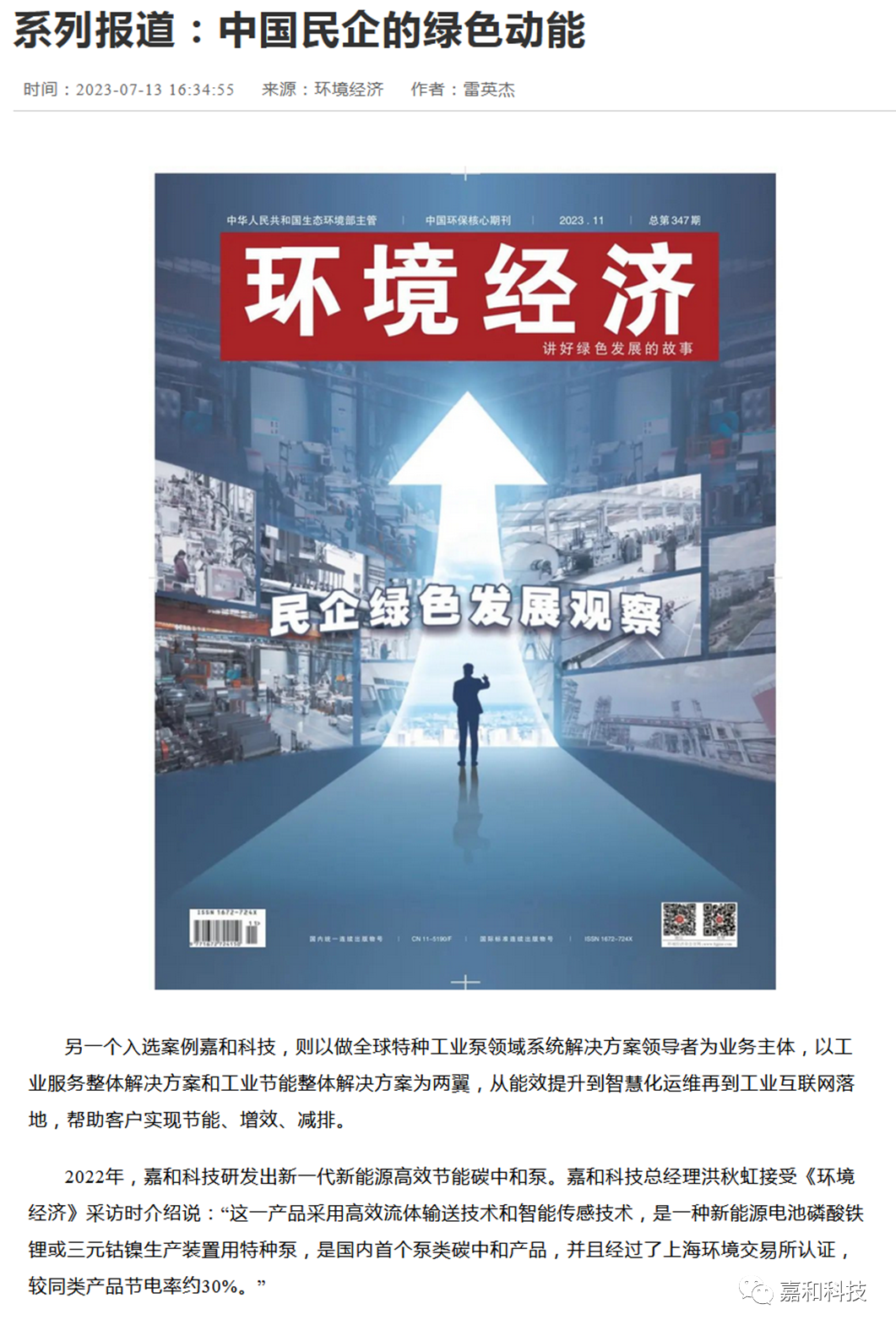 В настоящее время, с продвижением целей «достижения пика углерода и углеродной нейтральности», концепция зеленого развития среди частных предприятий Китая непрерывно развивается, демонстрируя значительные результаты. В конце 2022 года Всекитайская федерация промышленности и торговли выпустила «Отчет о зеленом развитии частных предприятий Китая (2022 г.)» (далее – «Отчет»), который был опубликован на таких ведущих платформах, как сайт Правительства Китая, газета People's Daily, информационное агентство Синьхуа, сеть Гуанмин, экономическая справочная сеть, сайт Sina и другие СМИ. Отчет подводит итоги 2021 года, представляя достижения частных предприятий Китая в области производства, снижения загрязнений, энергосбережения и сокращения выбросов углерода, а также зеленой трансформации и модернизации. В документе представлено 17 примеров зеленого развития частных предприятий, демонстрирующих успехи и опыт в различных отраслях. Цзяхэ была отмечена в Отчете как выдающийся пример в области машиностроения. Этот случай также является одним из трех типичных примеров, перепечатанных авторитетным журналом «Экономика окружающей среды».